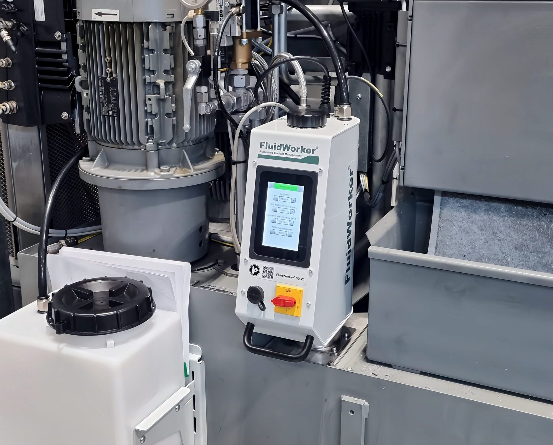 Kühlschmierstoff ist der „Lebenssaft“ einer Werkzeugmaschine. Er kühlt die Werkzeuge, spült Späne vom Werkstück und aus dem Arbeitsraum. Ohne ihn bleibt die Maschine stehen. Die Stabilität des Kühlschmierstoffes ist von enormer, oft unterschätzter Bedeutung. Ein neuer FluidWorker® sorgt jetzt für konstante Mischung und optimalen Füllstand im Maschinentank.